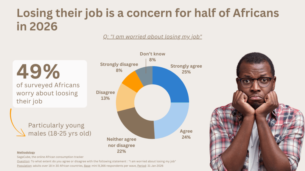 Economic pressure is clearly visible in employment perceptions. Nearly 49% of Africans worry about losing their job, with even greater concern among younger consumers.