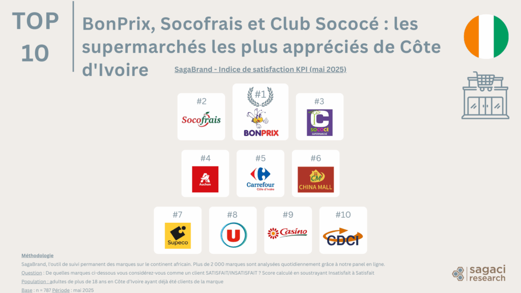 Une récente étude SagaBrand, notre outil de suivi des marques en Afrique, classe les supermarchés ivoiriens selon la satisfaction client. Les membres du panel en ligne ont évalué les enseignes fréquentées, identifiant celles qui les satisfont ou non. Poursuivez votre lecture pour découvrir quels sont les supermarchés les plus populaires en Côte d’Ivoire en ce moment.